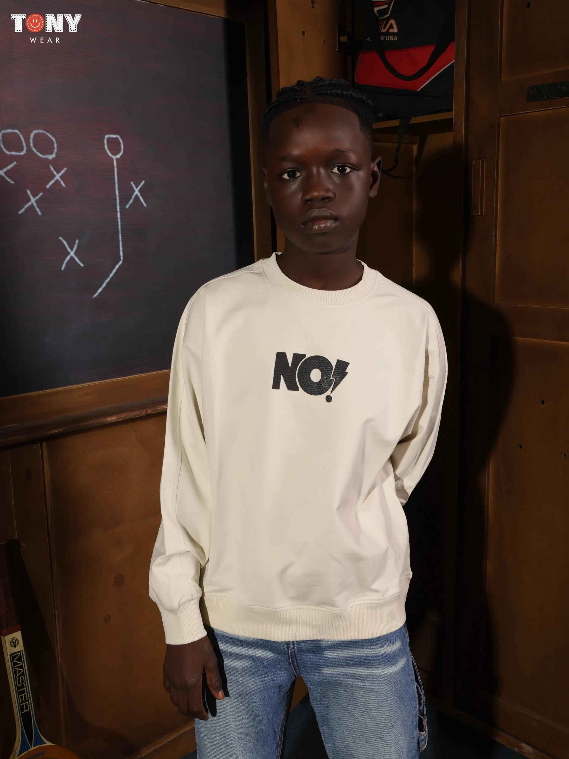 طباعة مؤثرة: يتميز وسط الصدر بكلمة “لا!” بخط عريض بدون زوائد. إنها رسمة فكاهية، حازمة، وعصرية تناسب شخصية الأولاد المستقلين.