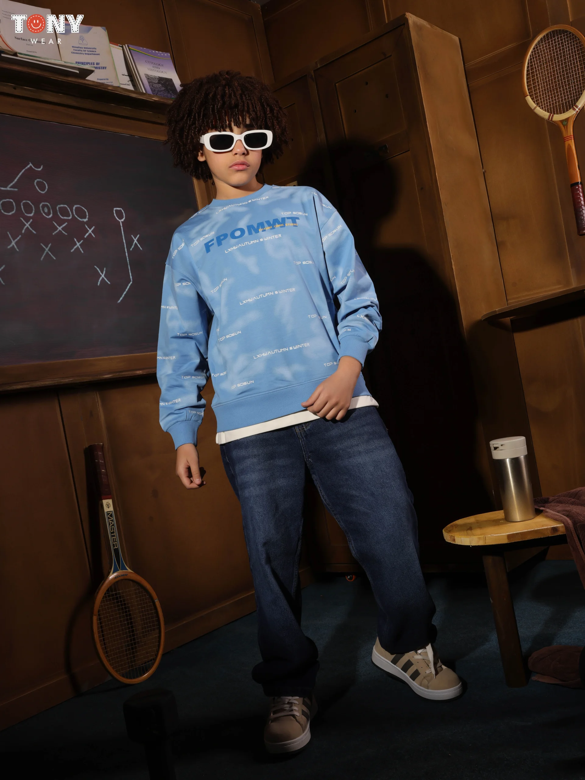 ارتقِ بإطلالة طفلك العصرية مع كنزة الصوف الصيفية القطنية من FPOMWT. تتميز هذه الكنزة الجريئة بنسيج رخامي أنيق بنمط “غسيل السحاب” وطبعة كتابية متكررة، تجمع بين لمسة عصرية جريئة وقطن صيفي ناعم ومريح.