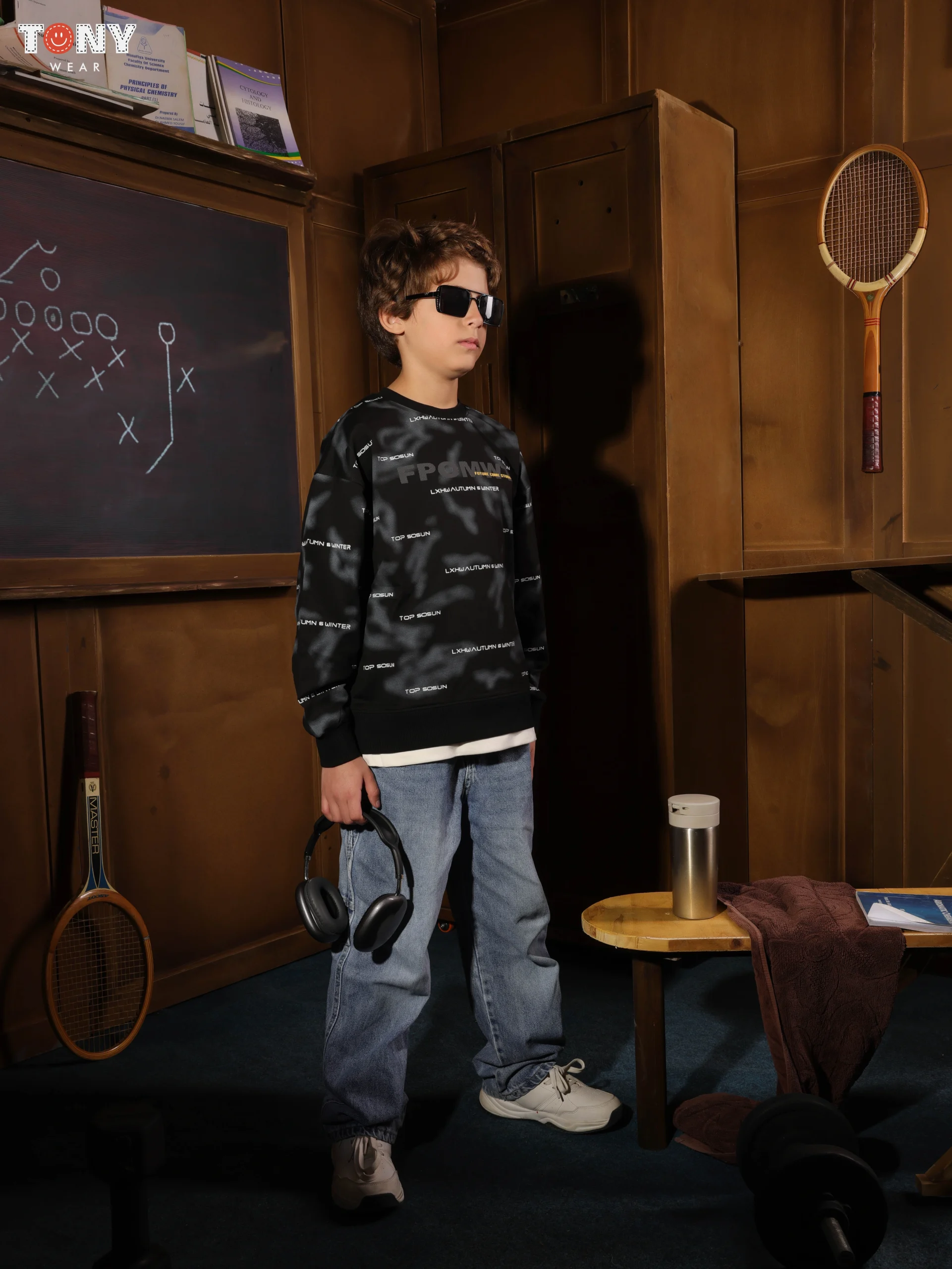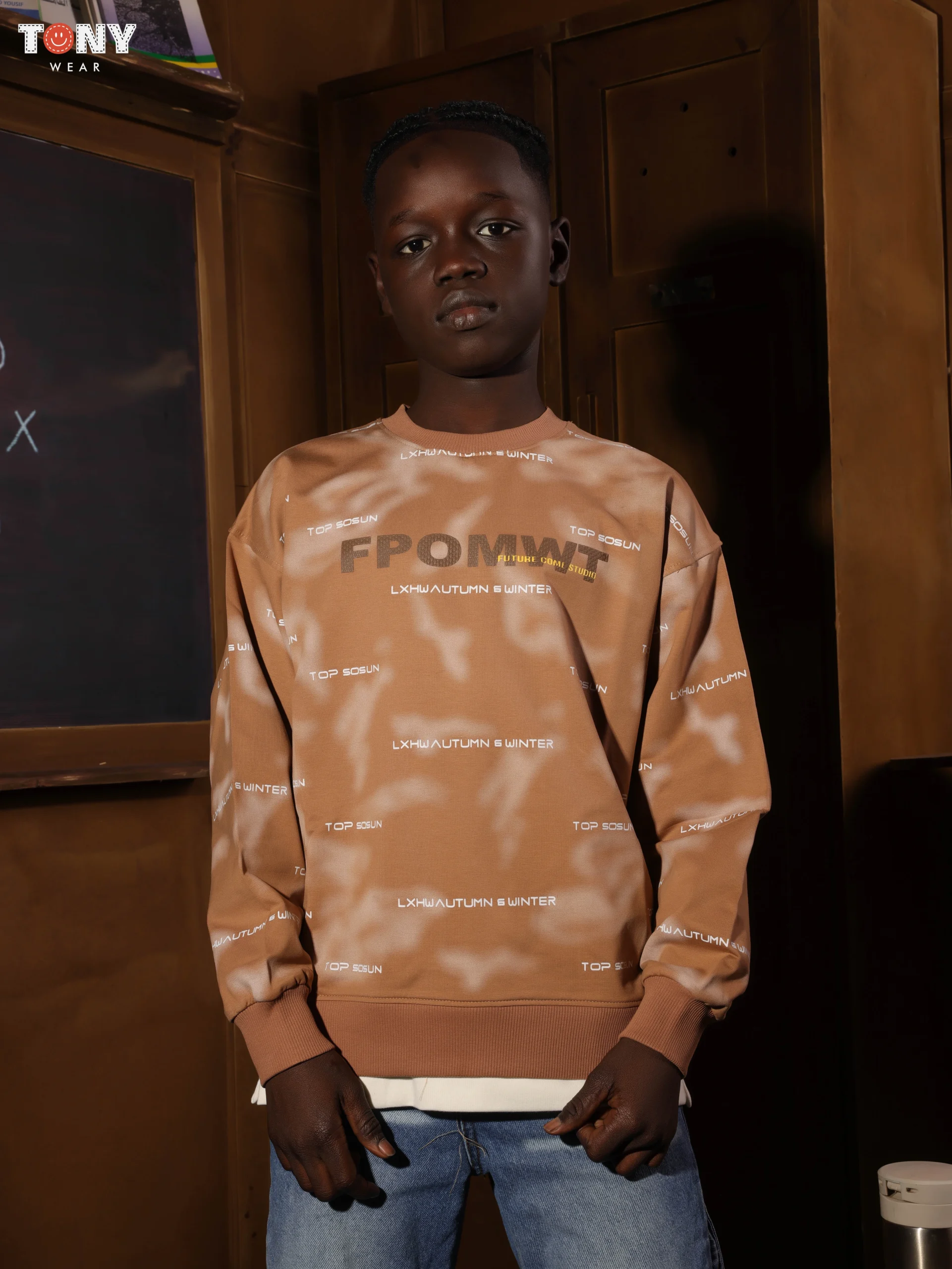 طباعة طباعية شاملة: بالإضافة إلى شعار الصدر الكبير “FPOMWT”، فإن الخلفية مغطاة بخطوط نصية متكررة أصغر (مثل “TOP BOGUN” أو الرموز الموسمية)، مما يخلق نمطًا ديناميكيًا.