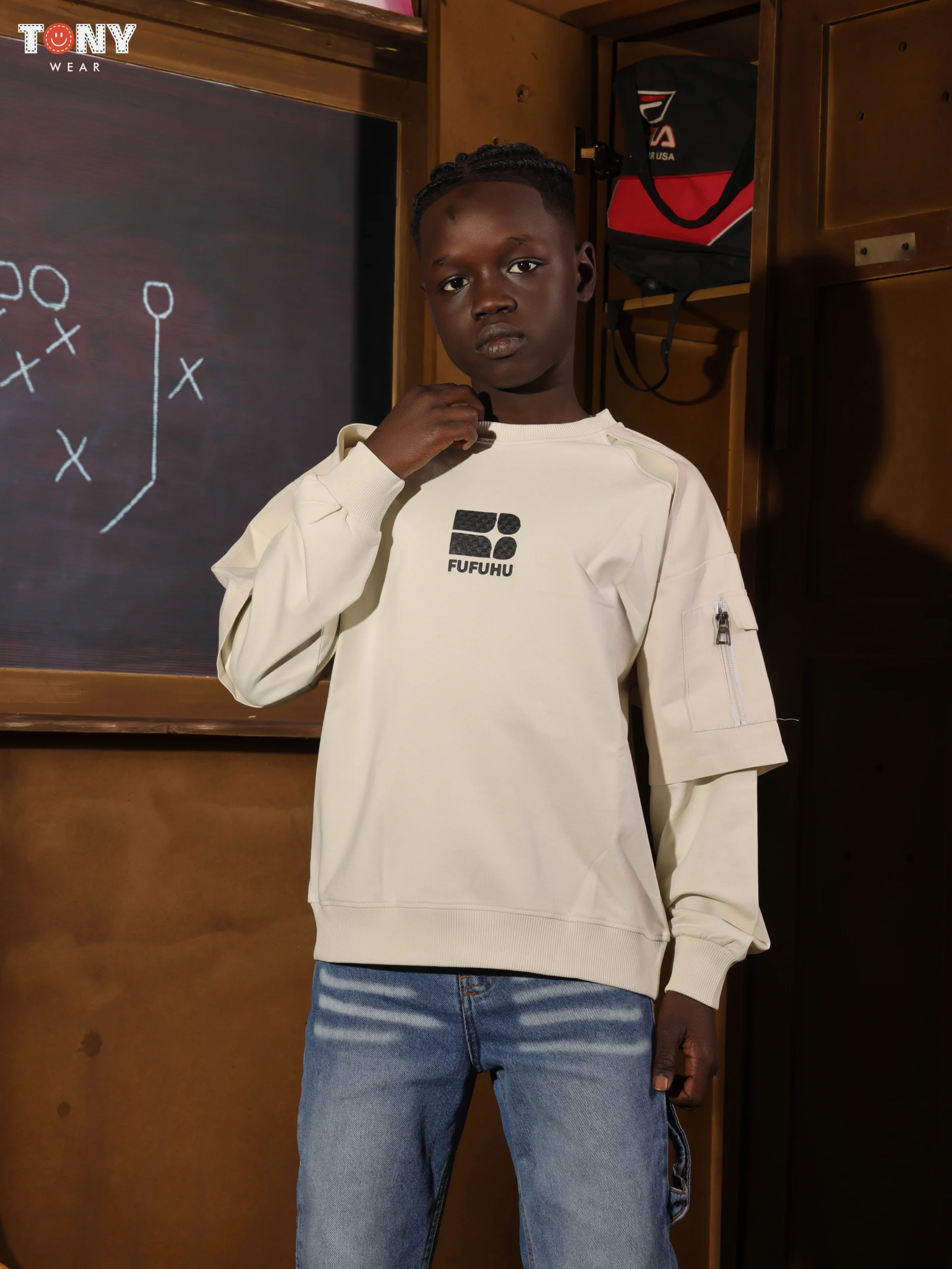 قم بترقية معداته مع سترة Crewneck القطنية الصيفية للأولاد مع جيب تقني. يجمع هذا السُترة الحديثة بين شعار صدري هندسي نظيف وجيب بسحاب وظيفي على الكم، مما يوفر مظهرًا “عمليًا” رائعًا في قماشنا الناعم القابل للتنفس.