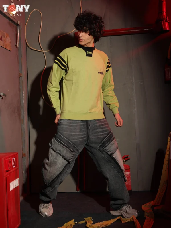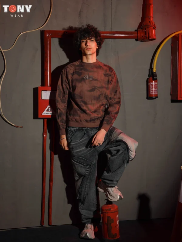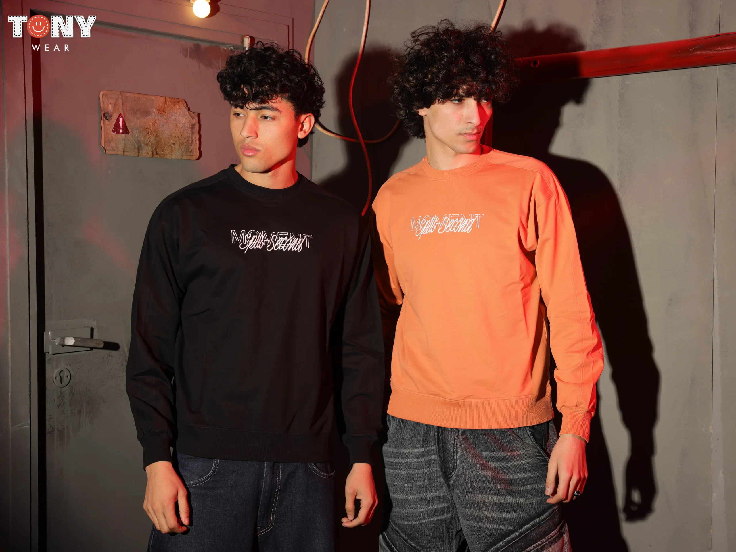 The Urban Warmth (Orange): The Burnt Orange pullover brings a pop of color. Pair it with textured grey jeans (right model) to create a rugged, industrial aesthetic. The warm orange tone looks great against cool grey denim.