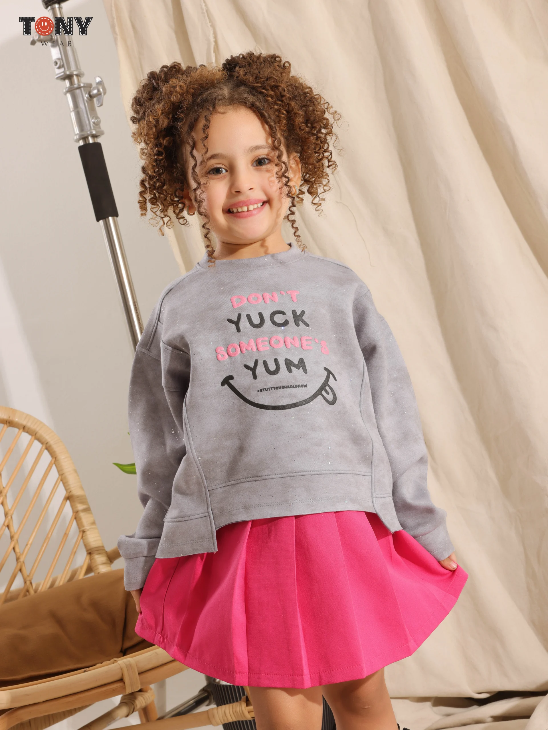 The Trendy Pop (Grey): The Grey pullover has bright pink text. Style it with a hot pink pleated skirt to match the font. It?s a high-energy look that is fun and fashionable.